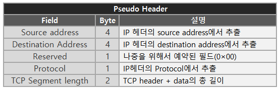 TCP checksum을 계산하기 위해서는 pseudo header라는 것이 필요하다. pseudo header는 TCP의 checksum을 계산하기 위해서 필요한 추가적인 데이터로 다음과 같은 정보를 포함한다.